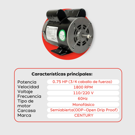 Motor Eléctrico Monofásico CENTURY 0.75 HP 1800 RPM (baja)